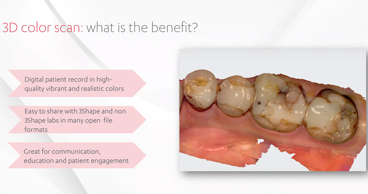 Another thing is color. Back in the days monochrome was still the standard, but intraoral scanners have gotten better and better in their color representation. As a GP or as a dental technician you can really benefit from this. Of course, when you have the patient on the chair, color is a great communication tool because you can perform a diagnostic scan and show their oral cavity in 3D and real colors. These scans will also help in the conversation between clinician and patient. Think about it: you will have potential caries, current oral health status, oral hygiene, preparation assessment and selection of enamel and dentin shade, all in one place!