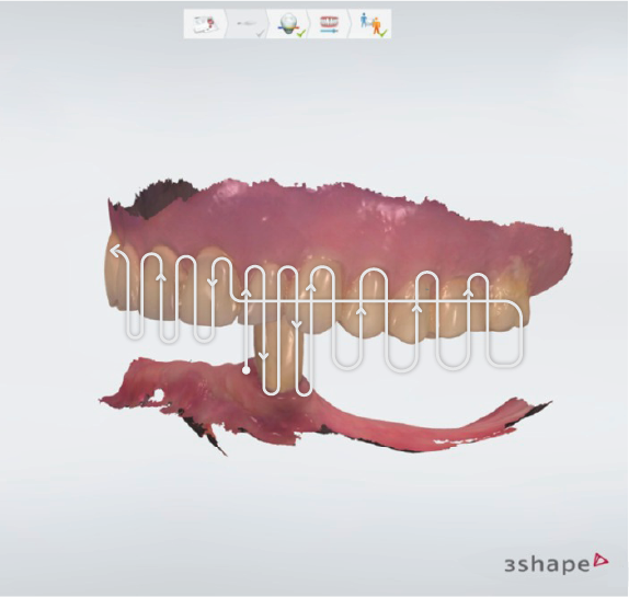 The primary reason I go past the midline in complex full arch bite record taking, is that you need to collect as much data as possible to aid the system in putting all the pieces of the bite puzzle together. This might mean taking the scanner out of the mouth (don’t push the button to stop recording though), repositioning your body - hand and scanner - and then putting it back in the mouth for additional record taking by picking up where you left off. If you go past the midline in the first stage, finding a re-reference point to continue the bite into the next quadrant is much easier.