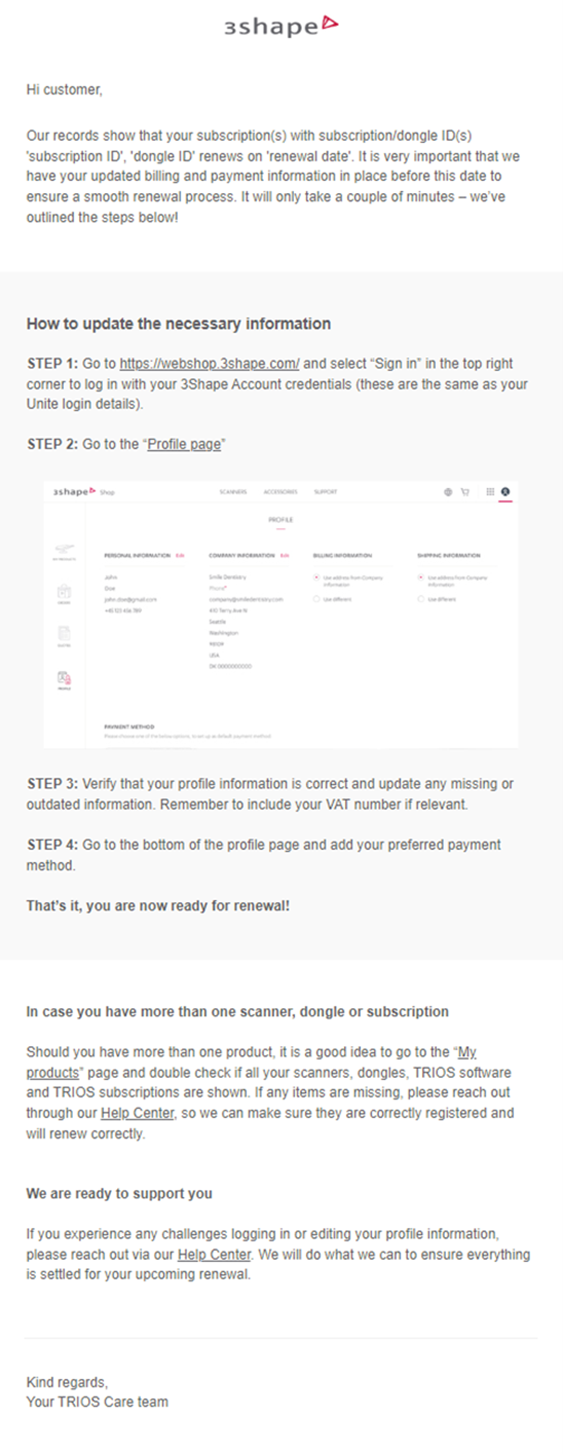 If you missed the emails, please find them below to get an understanding of how to renew your subscription directly with 3Shape on the 3Shape subscriptions management site.