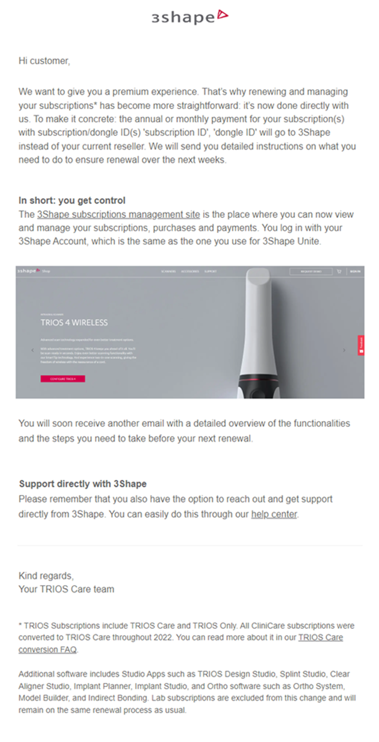 Correos electrónicos sobre la renovación de la suscripción directamente con 3Shape