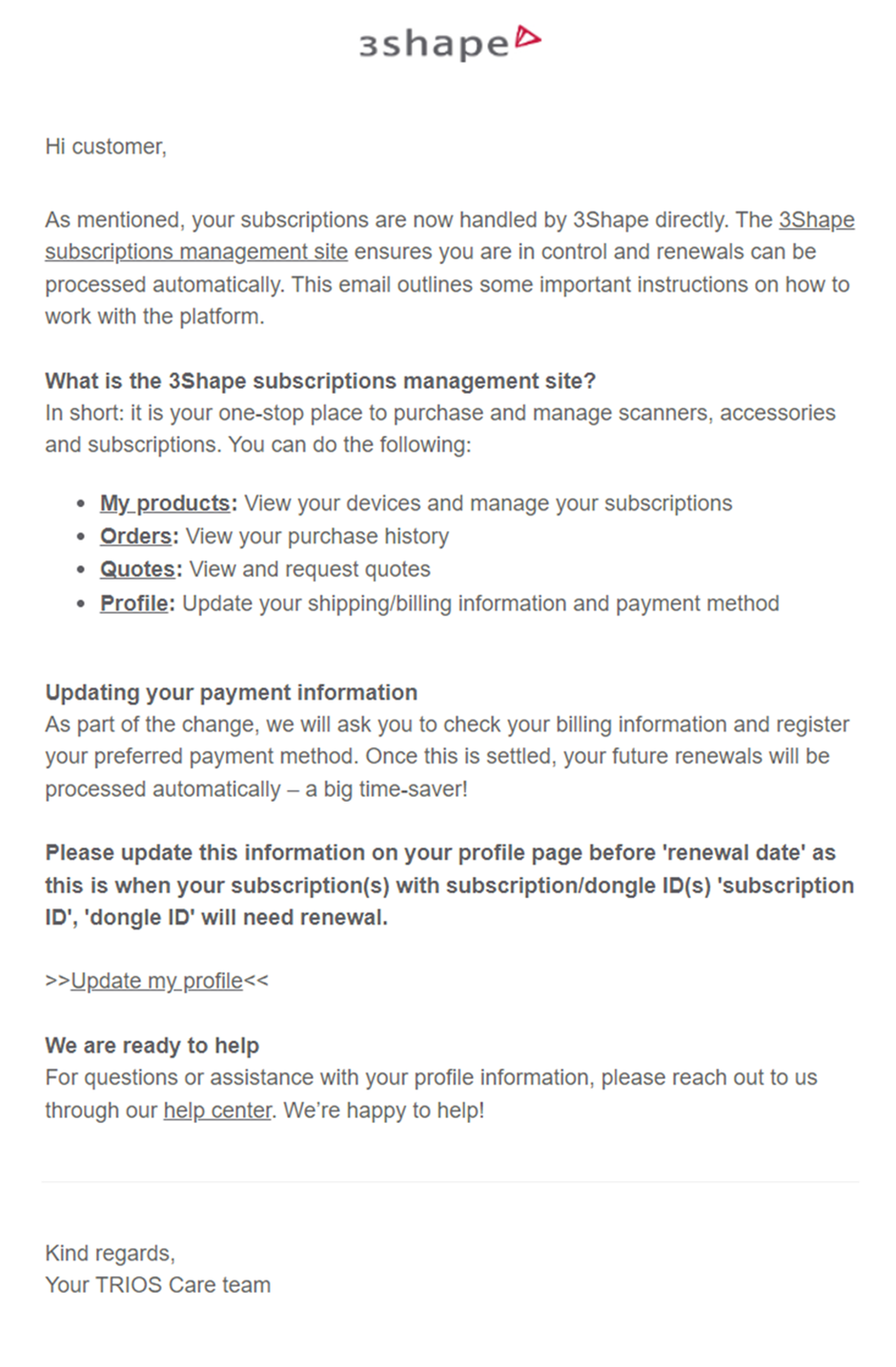También te aconsejamos que compruebes la dirección de correo electrónico de tu 3Shape Account. Estamos enviando correos electrónicos en los que se describe el proceso de gestión de las suscripciones. Puedes verlos a continuación.