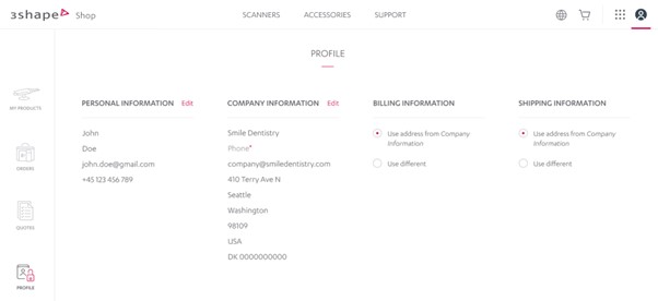 1. Abre tu cuenta del sitio de gestión de suscripciones 3Shape > haz clic en Perfil > comprueba si la Información de facturación está actualizada. Si es necesario cambiarlo, actualízalo en tu Perfil.