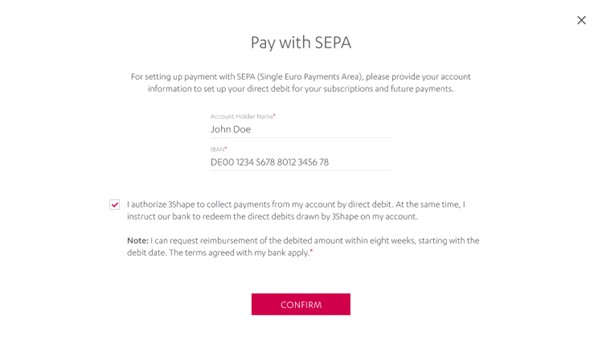 Resultado: Ahora tu suscripción se renovará automáticamente. La tarjeta/IBAN también se utilizará para otras compras en el sitio de gestión de suscripciones de 3Shape.